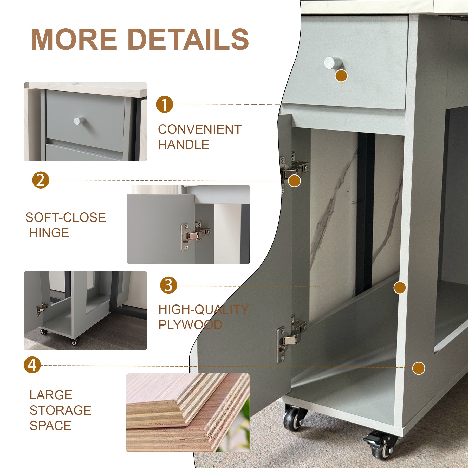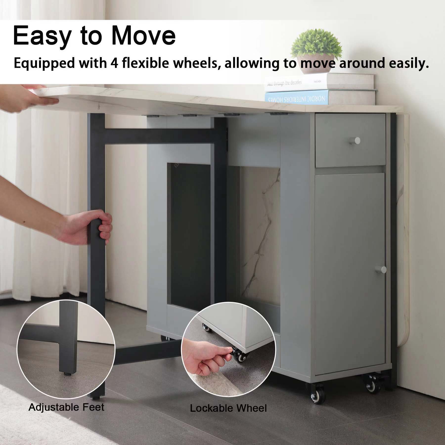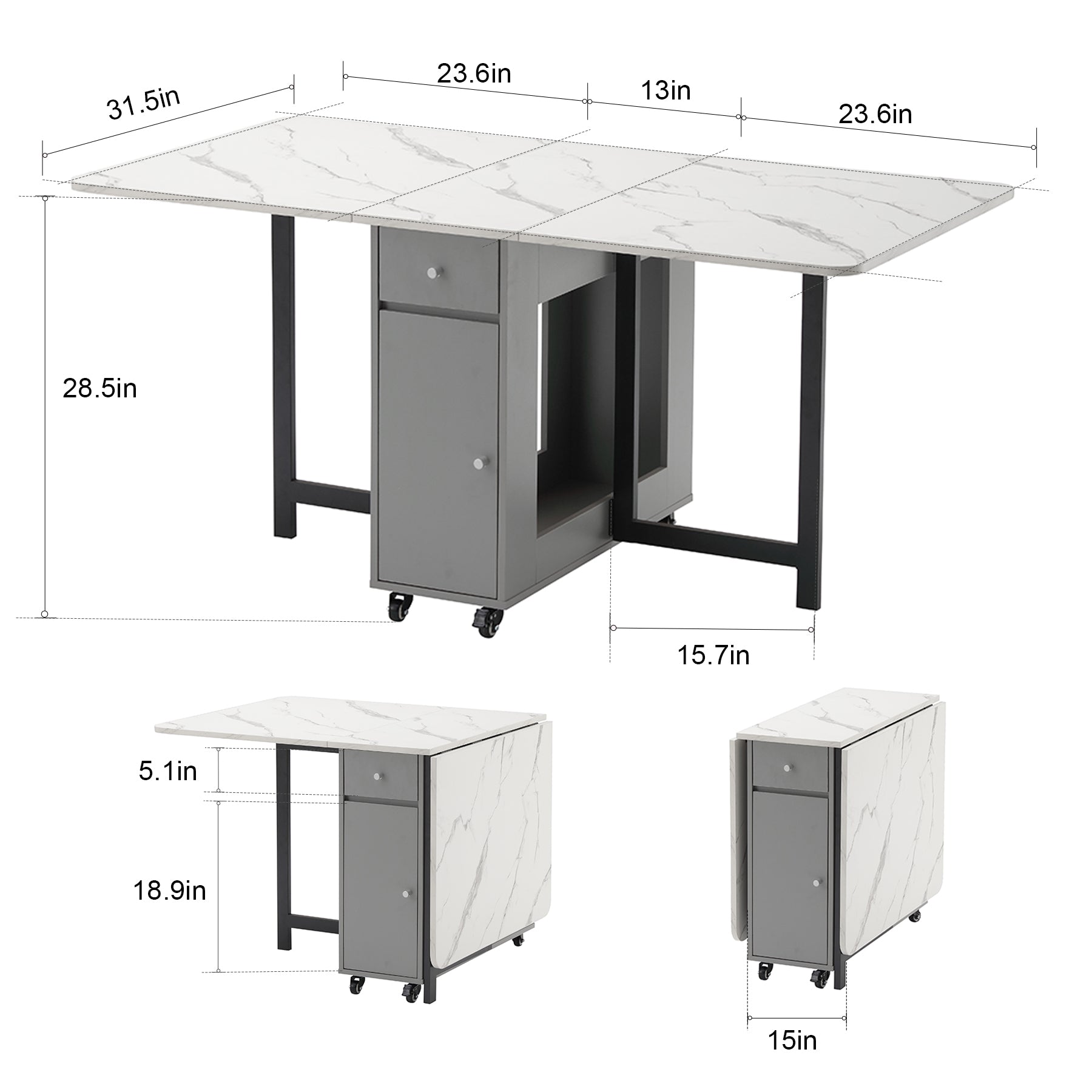 The drop leaf dining table is perfect for saving space and keeping things organized with its multifunctional and foldable design. The folding dining table features two foldable sides and two storage cabinets that minimize space while offering ample storage. The top drawer of this foldable table is ideal for kitchenware and other special items, and the bottom shelf can hold up to four folding chairs, making it convenient for neat storage. The folding table, when fully open, measures 60" L x 31.5" W x 28" H and can seat 6-8 people, making it suitable for serving guests. When closed, the small space dining table acts as a console table measuring 13" L x 31.5" W x 28" H, and when half open, the breakfast table is perfect for working, having coffee, or studying, and adapting to multiple scenarios. The kitchen & dining room tables are both sturdy and stylish, with an 18mm thick plywood tabletop and two durable iron legs in a matching natural color. The plywood construction of the extendable table is more durable and maintains its shape better than MDF, making the folding dining table ideal for small spaces. The foldable dining table with chairs available in wood, grey, or walnut, complements various home decor. The foldable kitchen table is covered with a waterproof layer that prevents dirt buildup, and stains can be easily cleaned with a few drops of water. The folding kitchen table has four universal wheels at the bottom, two of which can be locked for stability, allowing the table to be easily moved and securely positioned. User-friendly instructions make assembly easy, taking about 1-2 hours with two people and a power drill for faster installation. For any questions, please email us.