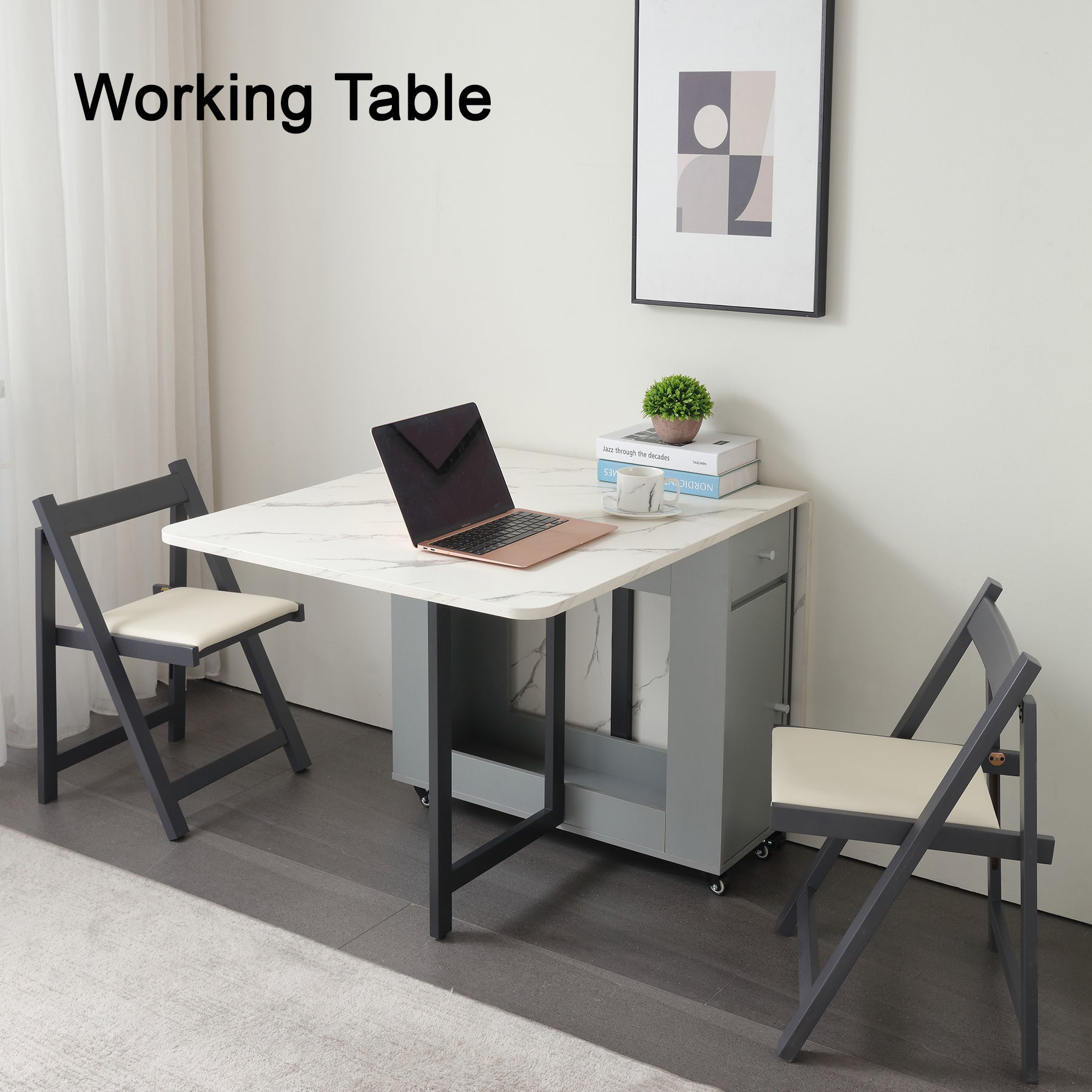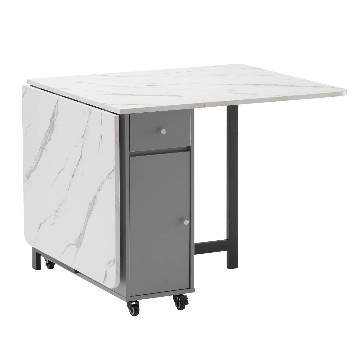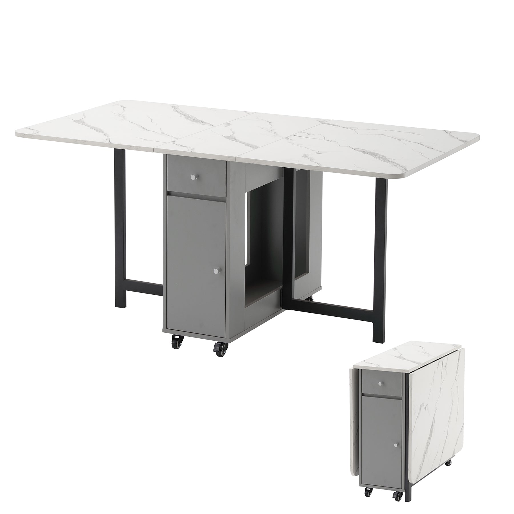 Folding Dining Table, Foldable Table for Space Saving, Drop Leaf Dining Table with 2 Drawers and 4 Wheels, Extendable Dining Table for Living Room, Kitchen, Farmhouse(Grey Marble )