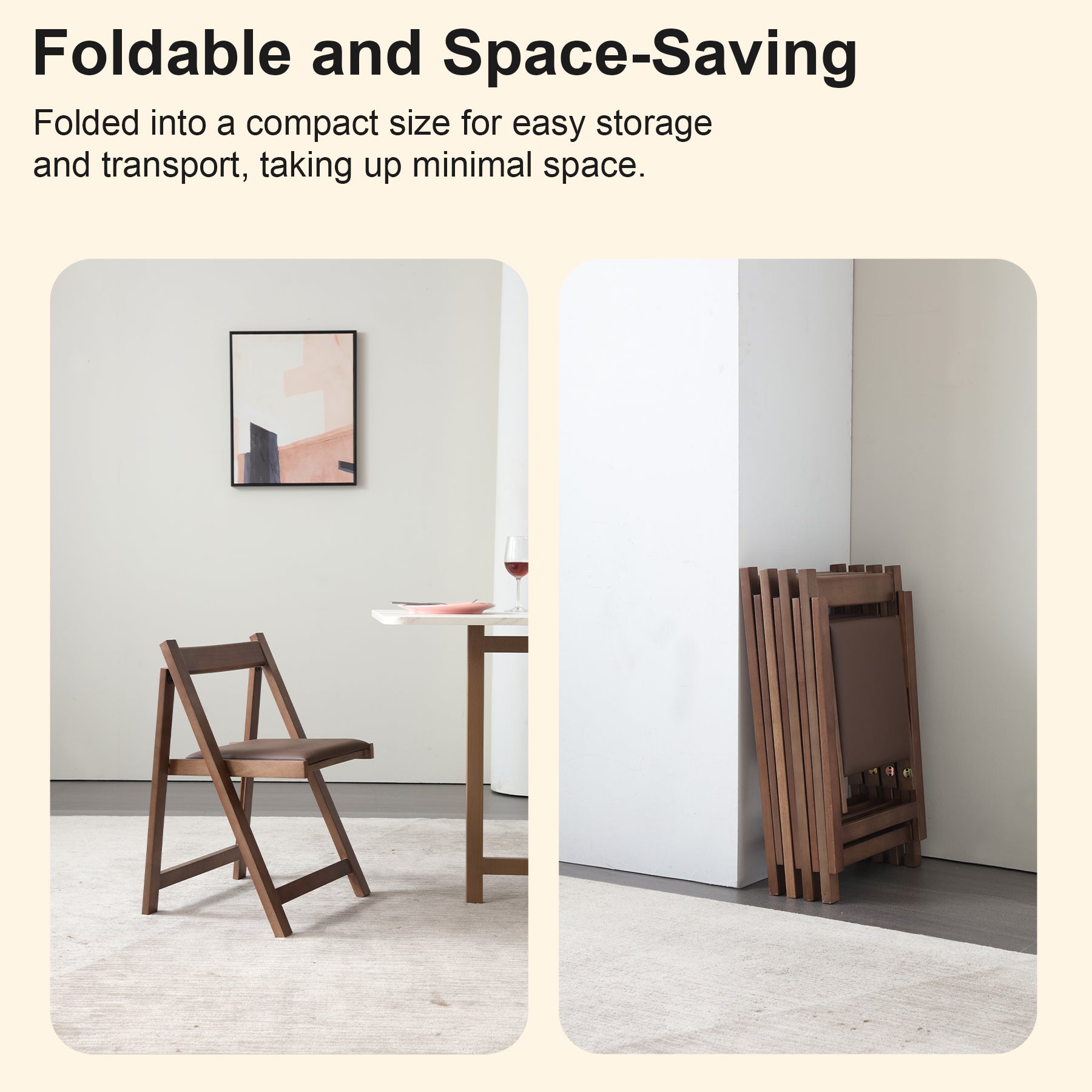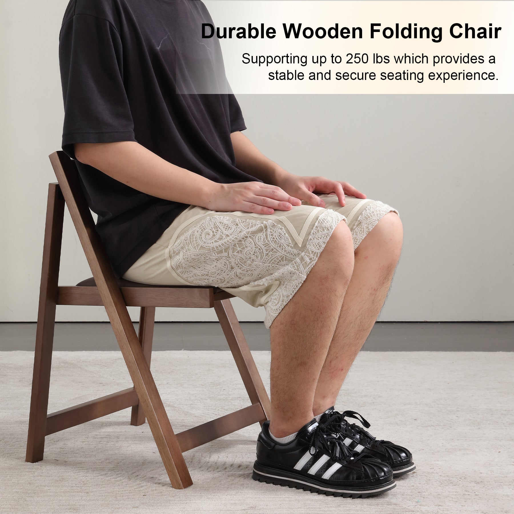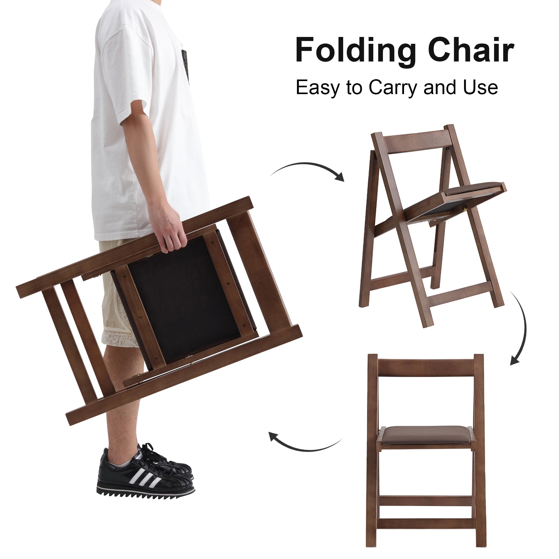 These lightweight and versatile outdoor chairs are perfect for both indoor and outdoor use, making them ideal for camping, party, banquets, patios, restaurants, coffee shops, or RVs. Weighing just 13 pounds, they are easy to lift, transport, and fold flat for space-saving storage when not in use. If you have limited storage space or prefer a clutter-free environment, this kitchen chair set of 2 offers a practical solution. Additionally, a foldable table can conveniently store up to four of these chairs, further maximizing your storage space at home. Crafted from natural wood, these folding desk chairs combine beautiful design with excellent craftsmanship. The smooth, hand-polished edges ensure comfort, while the ergonomic backrest provides solid support for your back. The soft seat cushion adds to the overall comfort, making long periods of sitting more enjoyable. These outdoor chairs folding come fully assembled and are ready to use right out of the box. Simply unpack and unfold them in minutes. Their lightweight design allows for easy placement against a wall, stacking, or storage in a closet, simplifying the storage process. With overall dimensions of 16.5"D x 17.3" W x 26"H and a seat height of 16.5", these chairs fold down to 2.2"D x 17.3" W x 28.7"H. Available in wood, walnut, and grey finishes, they can support up to 268 lbs.